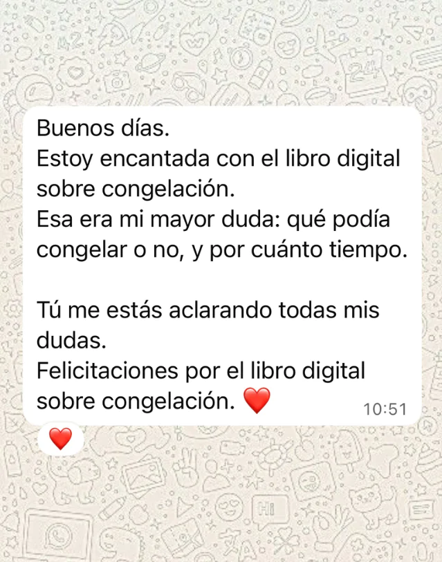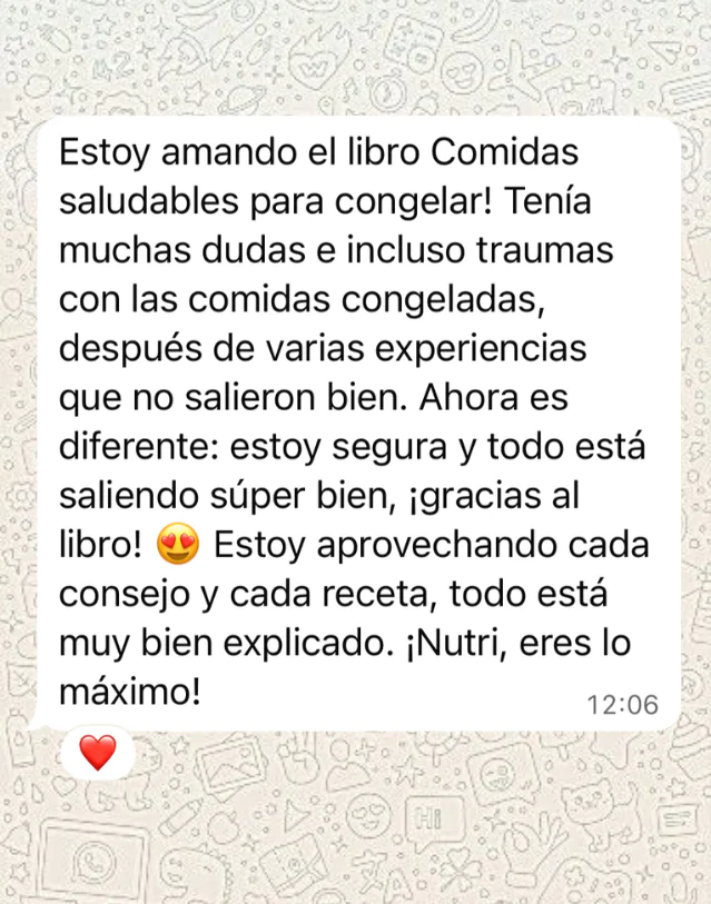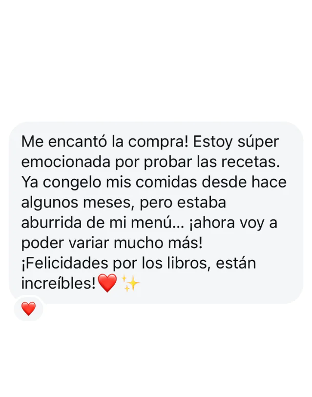 Recibes un libro digital completo con más de 90 recetas saludables para congelar, todas con paso a paso, fotos, rendimiento, porción sugerida, calorías y macronutrientes calculados.